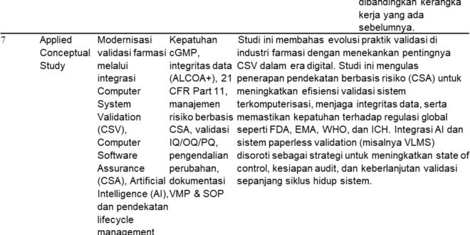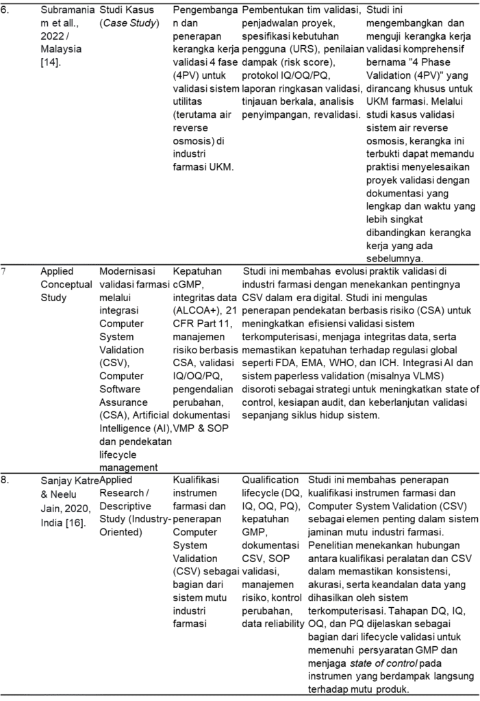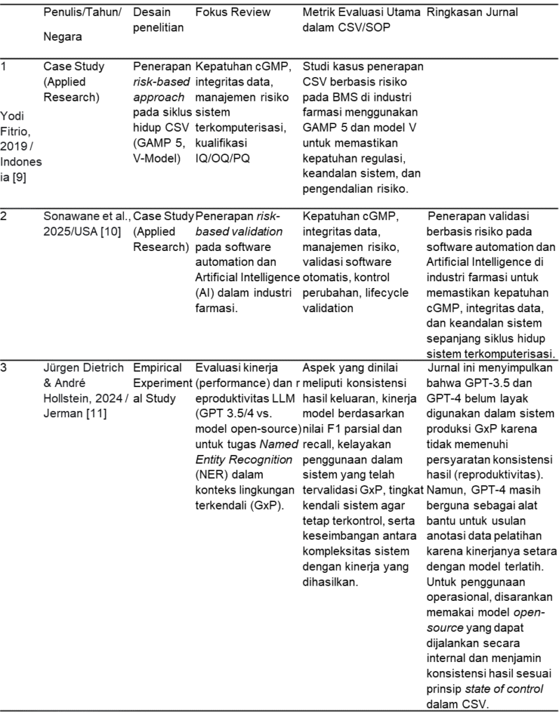 Penelitian ini merupakan Review Artikel yang dilakukan pada periode September hingga Oktober 2025. Fokus utama penelitian ini adalah melakukan kajian komprehensif terhadap penerapan Computerized System Validation (CSV) dalam industri farmasi. Penelaahan dilakukan terhadap berbagai sumber pustaka ilmiah, pedoman regulasi internasional, serta panduan teknis industri yang relevan, termasuk EU GMP Annex 11, FDA 21 CFR Part 11, serta pedoman GAMP 5 Edisi ke-2. Kajian ini mengintegrasikan aspek teoretis, regulatori, dan praktik terbaik (best practices) untuk memperoleh pemahaman yang menyeluruh mengenai peran CSV dalam menjamin mutu produk, kepatuhan terhadap regulasi, dan integritas data pada sistem komputerisasi di sektor farmasi, serta mengidentifikasi parameter kunci dan tantangan utama dalam penerapannya.[6].