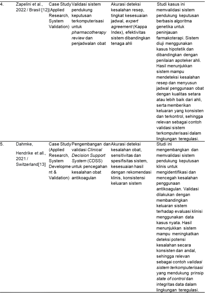 Perkembangan teknologi informasi turut memperluas cakupan dan kompleksitas CSV, khususnya dengan meningkatnya penggunaan sistem canggih seperti Artificial Intelligence (AI) dan sistem pendukung keputusan otomatis [10,12]. Sonawane et al. 2025 mengkaji tantangan validasi perangkat lunak otomasi dan AI dalam konteks GxP, sementara pada penelitian yang dilakukan oleh Dietrich dan Hollstein. 2025 memberikan bukti empiris terkait keterbatasan Large Language Models (LLM) generatif, seperti GPT-4, yang dinilai belum memenuhi persyaratan reproduktibilitas dan determinisme yang kritis untuk digunakan secara langsung dalam lingkungan produksi GxP [10–12]. Oleh karena itu, mereka merekomendasikan penggunaan model open-source yang dapat dikendalikan secara internal guna menjamin keberlangsungan state of control. Sebaliknya, studi oleh Zapelini et al. 2022 dan Dahmke et al. 2024 menunjukkan bahwa sistem pendukung keputusan berbasis algoritma, seperti algoritma genetika, dapat divalidasi secara memadai untuk aplikasi klinis [12,13]. Sistem tersebut terbukti menghasilkan keluaran yang konsisten, akurat, dan sebanding dengan penilaian ahli, sehingga memperkuat peran CSV dalam meningkatkan keselamatan pasien dan mendukung pengambilan keputusan klinis yang andal.