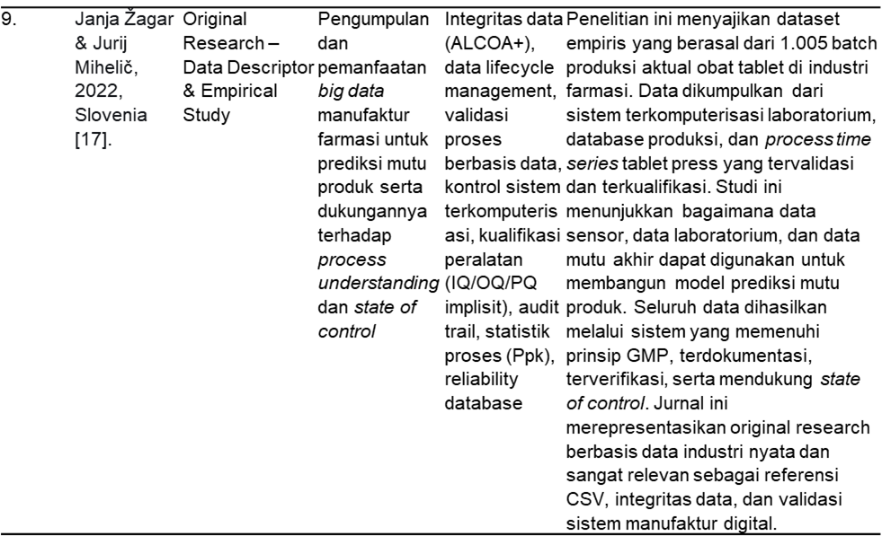 Pondasi utama dari seluruh sistem tervalidasi tersebut adalah penerapan prinsip integritas data (ALCOA+), yang secara konsisten ditekankan dalam berbagai kajian [11,14]. Kawarkhe et al. 2025 serta Žagar dan Mihelič. 2022 menegaskan bahwa jaminan integritas data melalui kombinasi kontrol teknis dan prosedural yang memadai bukan hanya bertujuan untuk memenuhi kepatuhan regulasi, tetapi juga menjadi prasyarat bagi pemanfaatan data lanjutan, seperti analisis prediktif dan penerapan big data dalam kerangka Pharma 4.0. Selain itu, CSV tidak berdiri sendiri, melainkan terintegrasi erat dengan disiplin lain dalam sistem mutu farmasi. Katre dan Jain [8] menjelaskan bahwa kualifikasi peralatan (DQ, IQ, OQ, PQ) dan CSV merupakan dua aspek yang saling melengkapi dalam menjamin keandalan sistem terkomputerisasi secara menyeluruh, mencakup perangkat keras, perangkat lunak, dan proses operasional [15,17].