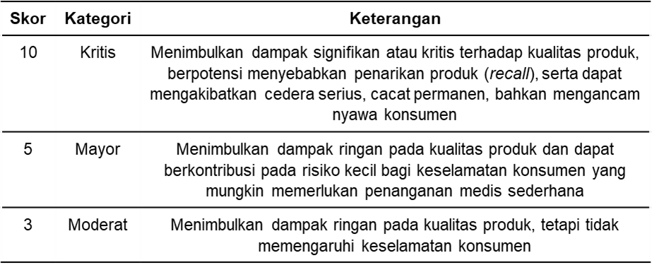 Analisis risiko adalah estimasi terhadap risiko terkait dengan bahaya yang diidentifikasi (11). Risiko dinilai berdasarkan tiga parameter, yaitu tingkat keparahan, probabilitas, dan deteksi keparahan (16). Ketiga parameter tersebut diberikan nilai dalam rentang 1-5 atau 1-10 yang dapat disesuaikan dengan kebutuhan dari masing-masing industri farmasi (17). Tingkat keparahan (severity) didefinisikan sebagai dampak yang dihasilkan jika risiko kegagalan terjadi (18). Tingkat keparahan dapat dinilai dengan cara memberikan skor seperti pada Tabel 1. Skor tingkat keparahan yang semakin tinggi memiliki arti bahwa risiko kegagalan semakin berdampak buruk pada mutu produk.