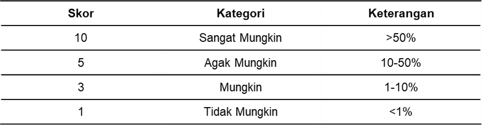 Tingkat probabilitas (probability atau occurrence) didefinisikan sebagai seberapa mungkin risiko kegagalan terjadi. (18). Tingkat probabilitas dapat dinilai dengan cara memberikan skor seperti pada Tabel 2. Skor tingkat probabilitas yang semakin tinggi memiliki arti bahwa risiko kegagalan sangat mungkin terjadi.