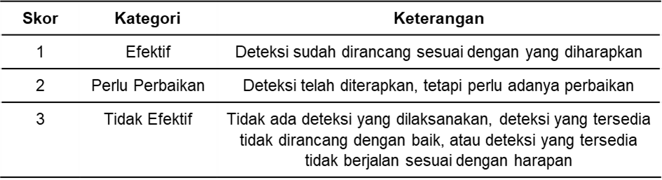 Tingkat deteksi (detection) didefinisikan sebagai kemampuan risiko kegagalan dideteksi sebelum terjadi (18). Tingkat deteksi dapat dinilai dengan cara memberikan skor seperti pada Tabel 3. Skor tingkat deteksi yang semakin tinggi memiliki arti bahwa belum ada deteksi yang dilaksanakan oleh industri farmasi atau deteksi yang tersedia tidak berjalan sesuai dengan yang seharusnya.