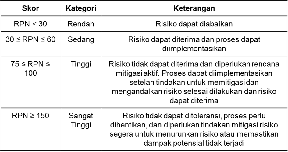 Evaluasi risiko merupakan kegiatan membandingkan risiko yang sudah diidentifikasi dan dianalisis terhadap kriteria risiko yang telah ditentukan (11). Evaluasi risiko dilakukan dengan cara menentukan nilai risk priority number (RPN) untuk memprioritaskan risiko kegagalan yang tindakan korektifnya akan ditentukan. Nilai RPN diperoleh dengan cara menghitung berdasarkan rumus berikut, yaitu nilai RPN = nilai keparahan (s) x nilai kejadian (p) x nilai deteksi (d) (19). Setelah diperoleh hasil nilai RPN, risiko digolongkan berdasarkan empat kategori, yaitu kategori rendah, sedang, tinggi, dan sangat tinggi seperti pada Tabel 4. Nilai RPN yang sangat tinggi memiliki arti bahwa risiko tersebut akan menjadi prioritas utama untuk dikendalikan atau diselesaikan (20). Akan tetapi, terkadang nilai RPN menunjukkan hasil nilai yang sama dari kombinasi nilai tiga parameter yang berbeda sehingga perlu dilakukan analisis lebih lanjut untuk menilai pasti dari suatu faktor risiko (21).