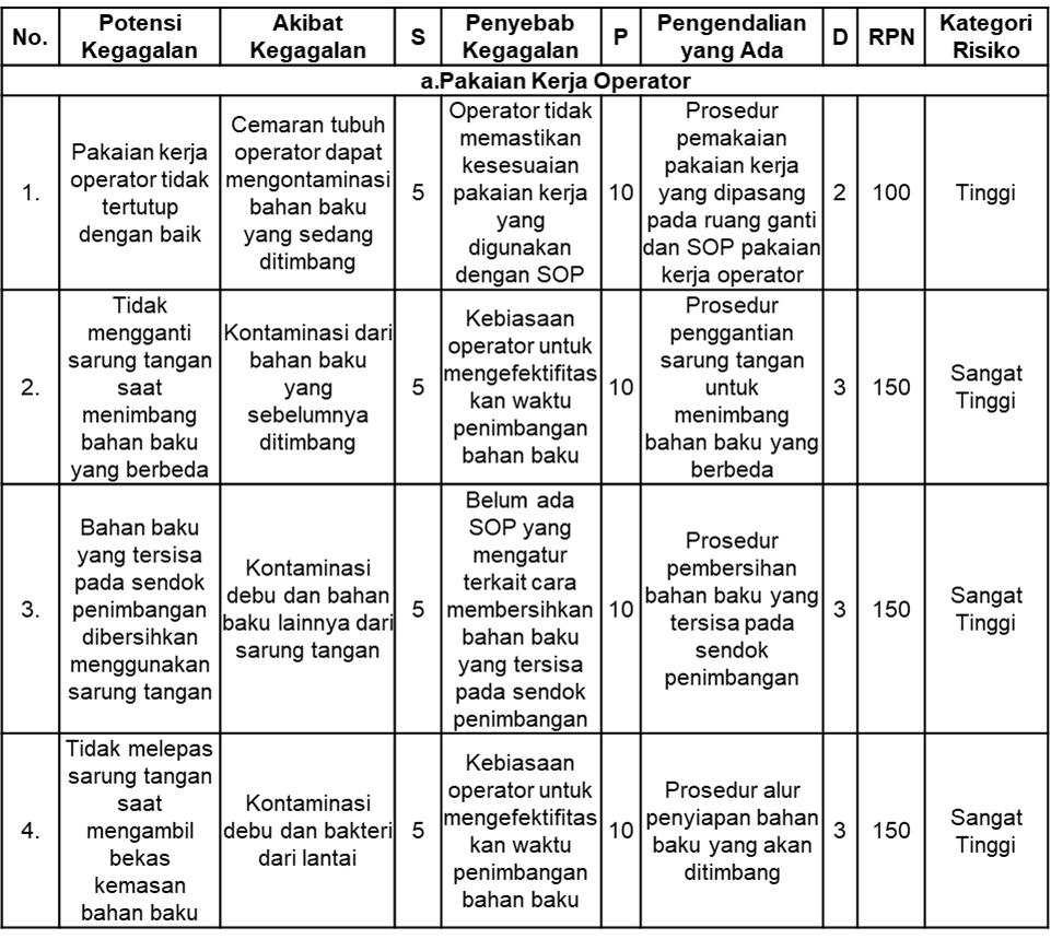 Empat risiko terkait pakaian kerja operator dan peralatan yang termasuk dalam kategori sangat tinggi akan menjadi prioritas untuk menentukan tindakan preventif dan pengendalian terhadap risiko kegagalan yang sebelumnya sudah teridentifikasi. Risiko kegagalan terkait dengan pakaian kerja operator adalah tidak mengganti sarung tangan saat menimbang bahan baku yang berbeda, membersihkan bahan baku yang tersisa pada sendok penimbangan langsung menggunakan sarung tangan, dan tidak melepas sarung tangan pada saat mengambil bekas kemasan bahan baku. Hal tersebut dapat menyebabkan adanya kontaminasi debu atau bakteri dari lantai serta kontaminasi dari bahan baku yang sebelumnya ditimbang. Kontaminasi dari bakteri menjadi permasalahan yang serius dalam industri farmasi karena dapat memengaruhi kesehatan konsumen. Hal tersebut juga dapat menyebabkan penarikan produk (recall), hilangnya reputasi industri farmasi, hingga kerugian secara finansial (27). Sedangkan risiko kegagalan terkait dengan peralatan adalah operator menggunakan sendok penimbangan yang sama untuk menimbang zat aktif dan zat tambahan. Hal tersebut dapat menyebabkan adanya kontaminasi bahan baku dari produk yang berbeda. Peralatan yang digunakan selama proses produksi, terutama pada saat penimbangan bahan baku yang berbeda perlu dibersihkan secara menyeluruh untuk memastikan bahwa tidak ada bahan baku dari produk lain yang tersisa. Selain itu, perlu dipastikan bahwa peralatan yang digunakan memiliki kuantitas yang sesuai dengan kebutuhan operator. Kedua hal tersebut bertujuan untuk menghasilkan produk sesuai dengan persyaratan mutu yang berlaku (28).