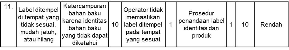 Risiko yang termasuk dalam kategori sedang adalah terkait penandaan, yaitu kesalahan pemberian label pada bahan baku yang masih tersisa. Risiko berkategori sedang dapat diterima karena tingkat deteksi yang dirancang sudah diimplementasikan dan memiliki hasil sesuai dengan yang diharapkan (16). Selama proses penimbangan berlangsung, terdapat dua orang operator yang selalu melakukan double check terkait penandaan dan dokumentasi sehingga risiko tersebut akan mudah terdeteksi.