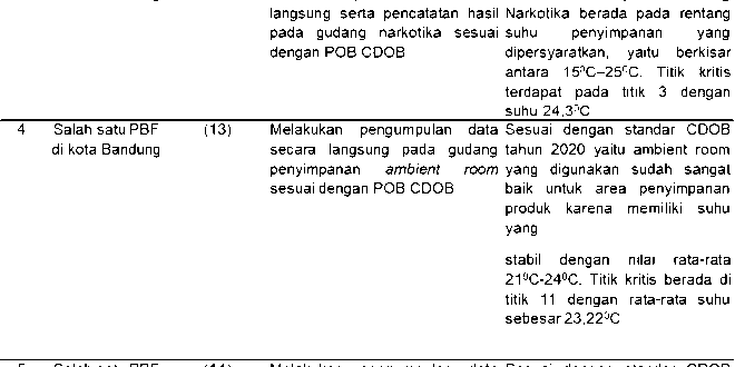 Berdasarkan studi literatur didapatkan sembilan studi mengenai pemantauan (mapping) suhu yang dilakukan pada beberapa PBF di Bandung dan di Jakarta. Sebagian besar studi tidak menjelaskan identitas PBF yang ditelitinya. Studi yang dilakukan dominan menggunakan metode observasi langsung, serta ada pula yang melakukan wawancara dan formulir checklist. Hasil pencarian data berdasarkan metode dan hasil yang didapatkan tertera pada Tabel 1.