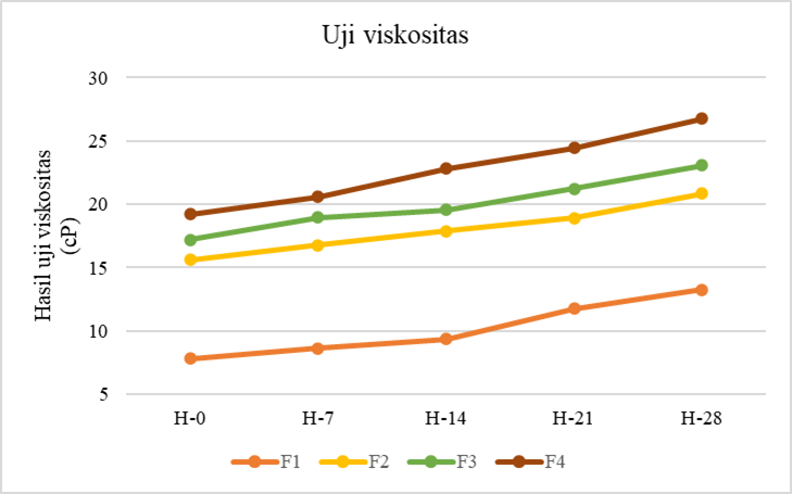 Pengujian viskositas bertujuan untuk mengetahu kekentalan dari sediaan krim dan merupakan suatu persyaratan tahanan dari suatu cairan untuk mengalir (14). Berdasarkan SNI 16-4399-1996 persyaratan viskositas krim yang baik, yaitu 2.000-50.000 cPs (12, 15). Sediaan krim yang baik harus memiliki sifat aliran pseudoplastic (18). Pengujian viskositas dilakukan pada hari ke-0, 7, 14, 21, dan 28. Berdasarkan Gambar 3. F1, F2, F3, dan F4 mengalami peningkatan viskositas. Konsentrasi Lipomulse luxe yang rendah, menunjukkan viskositas yang rendah dan menghasilkan krim yang lebih encer. Konsentrasi Lipomulse luxe yang tinggi, menunjukkan viskositas yang tinggi dan menghasilkan krim yang lebih kental. Namun, krim dengan viskositas yang tinggi menyebabkan rasa yang kurang nyaman saat digunakan. Viskositas sediaan krim dipengaruhi oleh ukuran droplet. Ukuran droplet yang kecil akan meningkatkan luas permukaan dan meningkatkan tahanan krim untuk mengalir dan meningkatkan viskositas. Viskositas yang baik ditunjukkan oleh semakin tinggi nilai viskositas, maka pergerakkan partikel akan cenderung semakin sulit, sehingga krim akan semakin stabil (19).