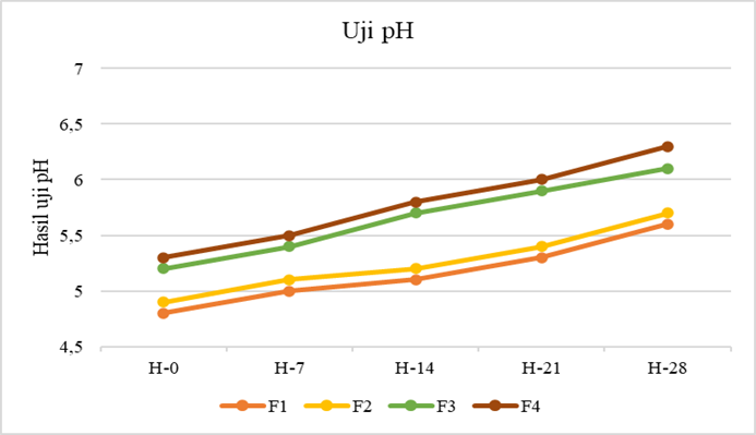 Pengujian pH pada sediaan krim bertujuan untuk mengetahui nilai asam dan basa dari sediaan krim (16). Sediaan krim F1, F2, F3, dan F4 yang diuji selama 28 hari dan diuji pada hari ke-0,7, 14, 21, dan 28. Hasil uji pH krim aromaterapi dapat dilihat pada Gambar 4.