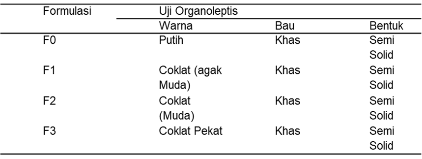 Uji organoleptis emulgel bertujuan untuk mengevaluasi sifat fisik dan kimia sediaan menggunakan pancera indra (penglihatan, penciuman, dan perabaan) untuk menilai warna, bau dan bentuk/tekstur/ konsistensi emulgel. Pengujian pada sediaan dilakukan dengan cara visual dilakukan untuk memantau stabilitas dan kualitas formulasi selama masa penyimpanan. Hasil uji organoleptis sediaan emulgel tanpa penambahan ekstrak adalah bening dengan bau khas, sedangkan dengan penambahan ekstrak 0,5% gel berwarnah coklat agak muda, dengan ekstrak 5% dan 10 % memiliki warna yang coklat dengan aroma yang khas bawang merah, maka semakin banyak % penambahan ekstrak maka semakin pekat warna coklat dari sediaan emulgel. Meskipun terdapat perbedaan warna antarfomula, semua formula bentuk fisik yang sama yaitu semi solid. Hal ini menunjukkan bahwa penambahan ekstrak berpengaruh signifikan terhadap perubahan warna, namun tidak memengaruhi bau maupun konsistensi fisik emulgel.