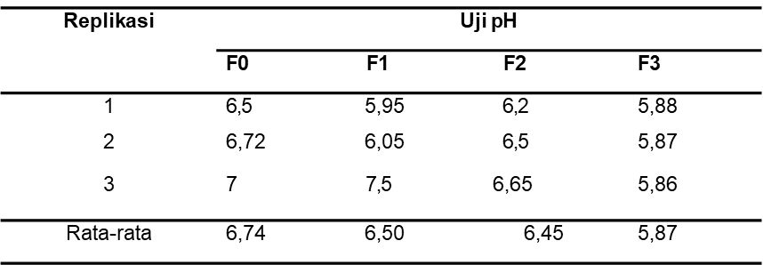 Hasil pengukuran pH emulgel pada Gambar 4.1, Hasil pengukuran pH menunjukkan penurunan seiring dengan peningkatan konsentrasi ekstrak kulit bawang merah, yaitu dari 6,74 (F0) menjadi 6,50 (F1), 6,45 (F2), dan 5,87 (F3). Penurunan ini dipengaruhi sifat asam ekstrak kulit bawang merah dengan pH sekitar 4,7 12. Meskipun demikian, seluruh nilai pH masih berada dalam rentang standar mutu SNI 16-4399-1996untuk sediaan kulit, yaitu (4,5–8,0) dan sesuai dengan pH kulit normal (4,5–7,5), sehingga sediaan emulgel dapat dikatakan aman untuk digunakan13,14,15.